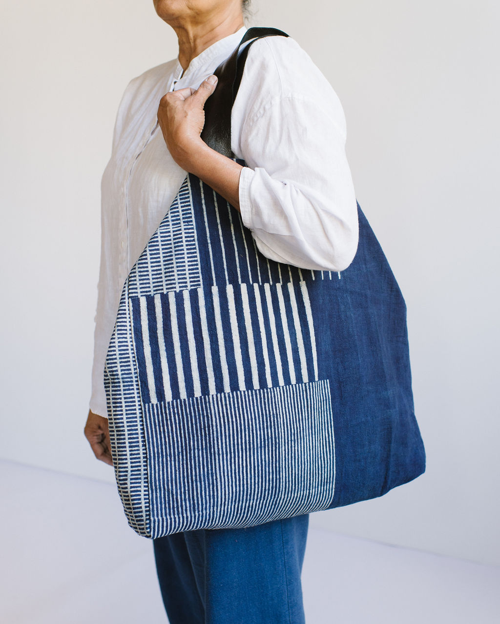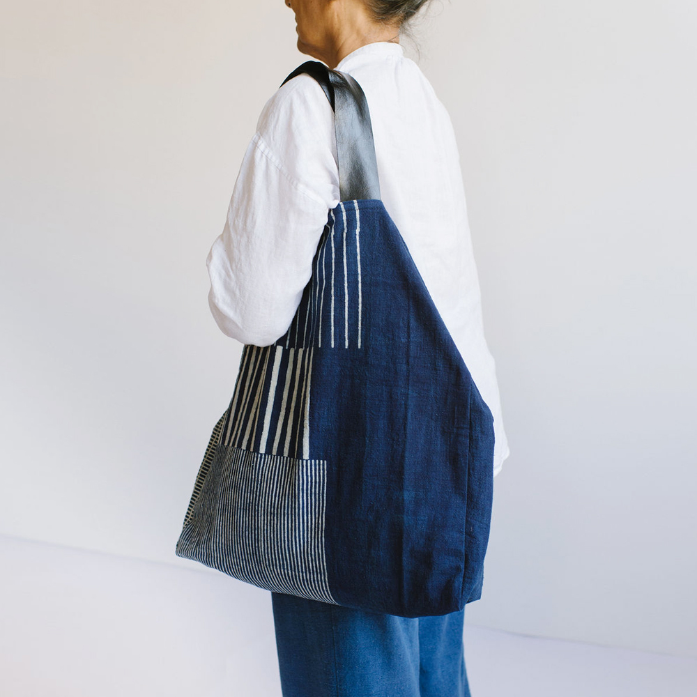 Oversized tote featuring a block-printed “sampling” pattern on durable handwoven Indigo Khaddar cotton. Fully lined with an interior zippered pouch, two ties to secure the top, and wide, soft black leather handles for comfortable carrying. Perfect for weekend shopping or travel days. Sustainable, stylish, and crafted to last.