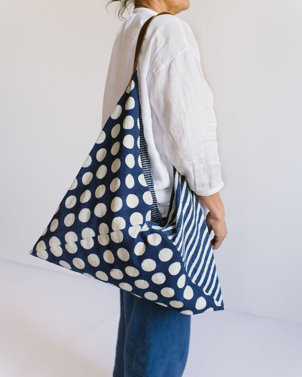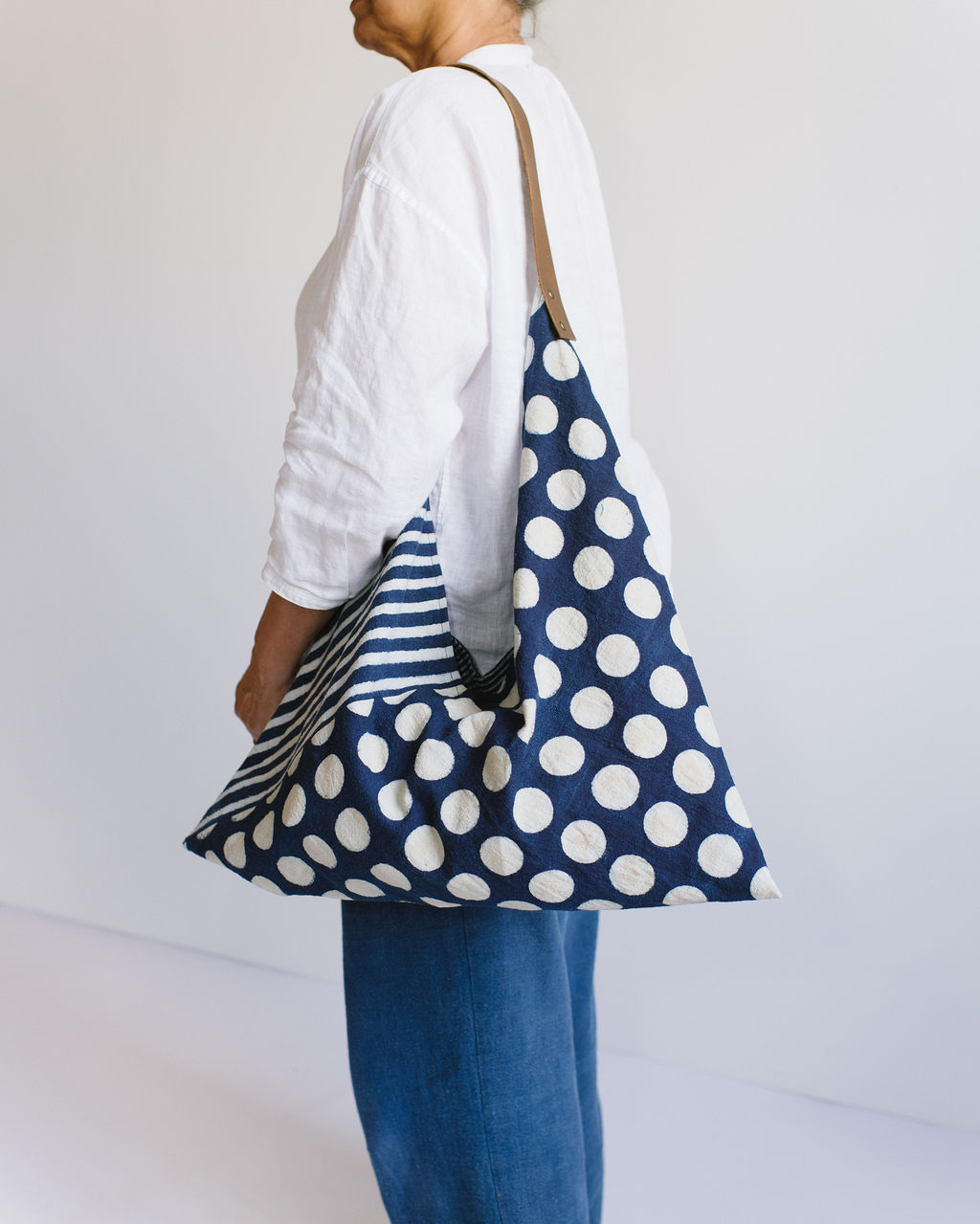Inspired by traditional Japanese bags, this tote uses ingenious folding to create a generous shoulder bag. Mix of Circles and Stripes with stripe printed lining in Indigo and a leather handle attached with rivets.