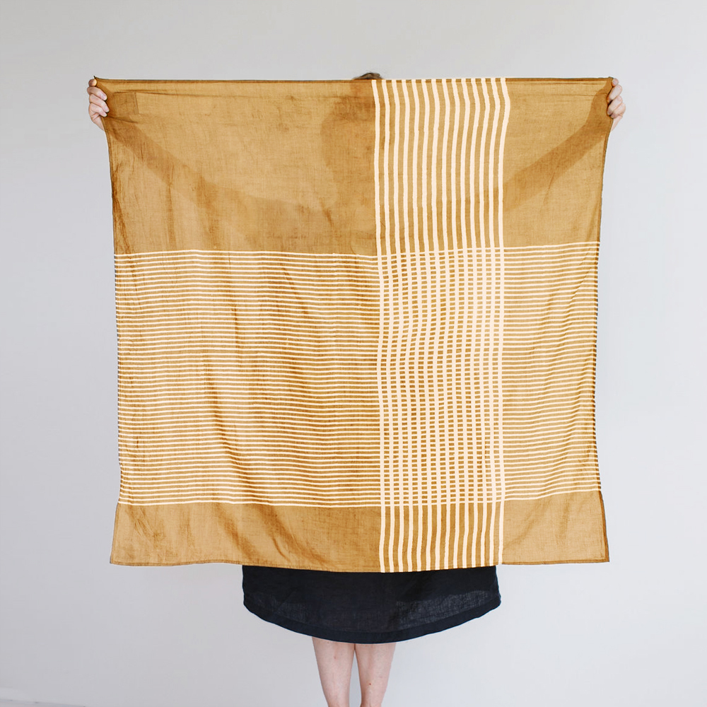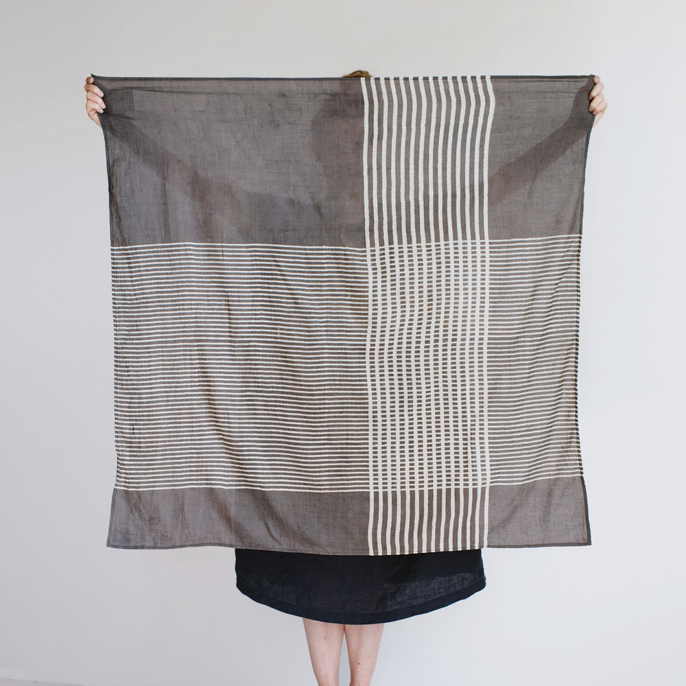 An ample square scarf showcasing a contemporary resist hand-block printed check design. Naturally dyed in a variety of rich, natural colors. Crafted from fine-weight cotton lawn fabric for a soft, breathable feel.